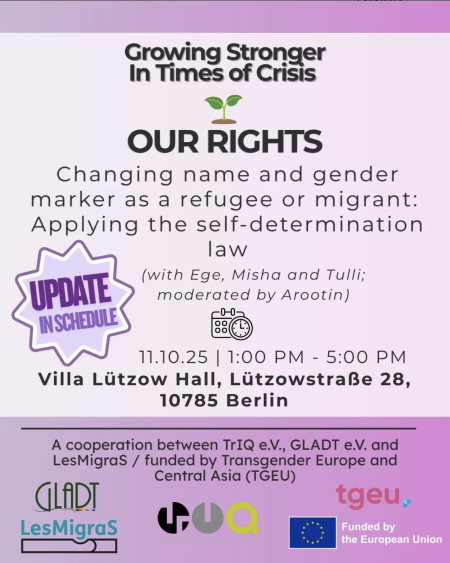 11.10.2025Name und Geschlechtseintrag ändern als geflüchtete oder migrierte Person: Zugang zum Selbstbestimmungsgesetz // TrIQ, LesMigraS & GLADT