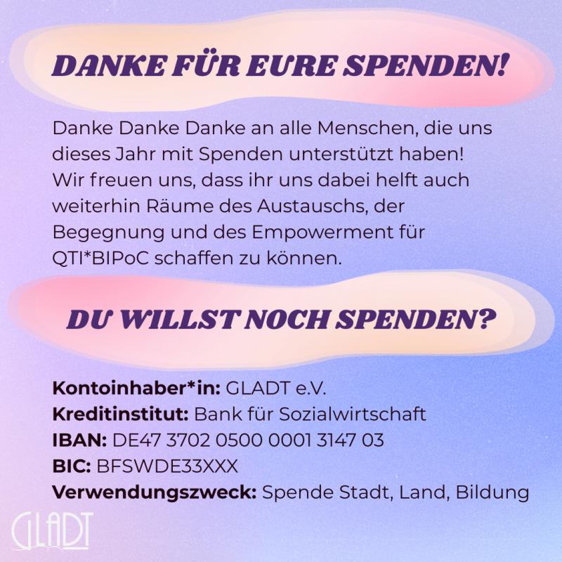 Wir freuen uns, dass ihr uns dabei helft auch weiterhin Räume des Austauschs, der Begegnung und des Empowerment für QTI*BIPoC schaffen zu können.