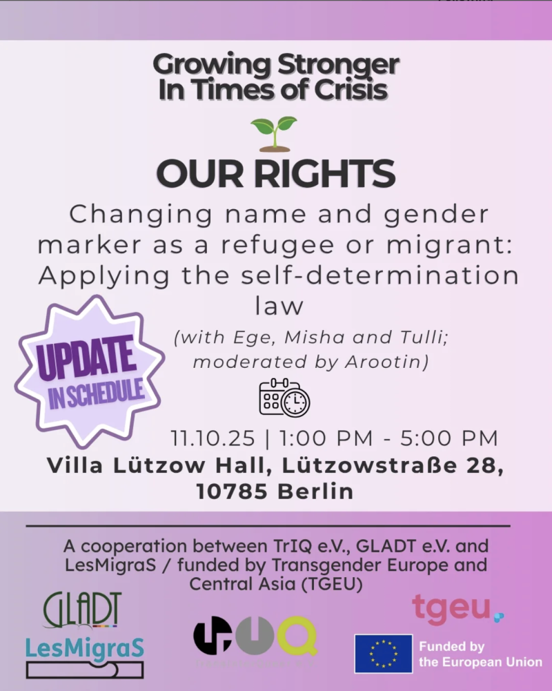 Zusammen mit TrIQ und LesMigraS möchten wir euch zu unserer Informations- und Austauschveranstaltung einladen: "NAME UND GESCHLECHTSEINTRAG ÄNDERN ALS GEFLÜCHTETE ODER MIGRIERTE PERSON: Zugang zum Selbstbestimmungsgesetz", mit Ege, Misha und Tulli, die ihre Erfahrungen mit dem SBGG als geflüchtete und migrierte bzw. als beratende Personen teilen werden, moderiert von Arootin. Nach diesen Inputs wird es etwas zu Essen geben und die Möglichkeit, sich auszutauschen und Tipps und Ratschläge aus der Community und durch beratende Personen zu erhalten.